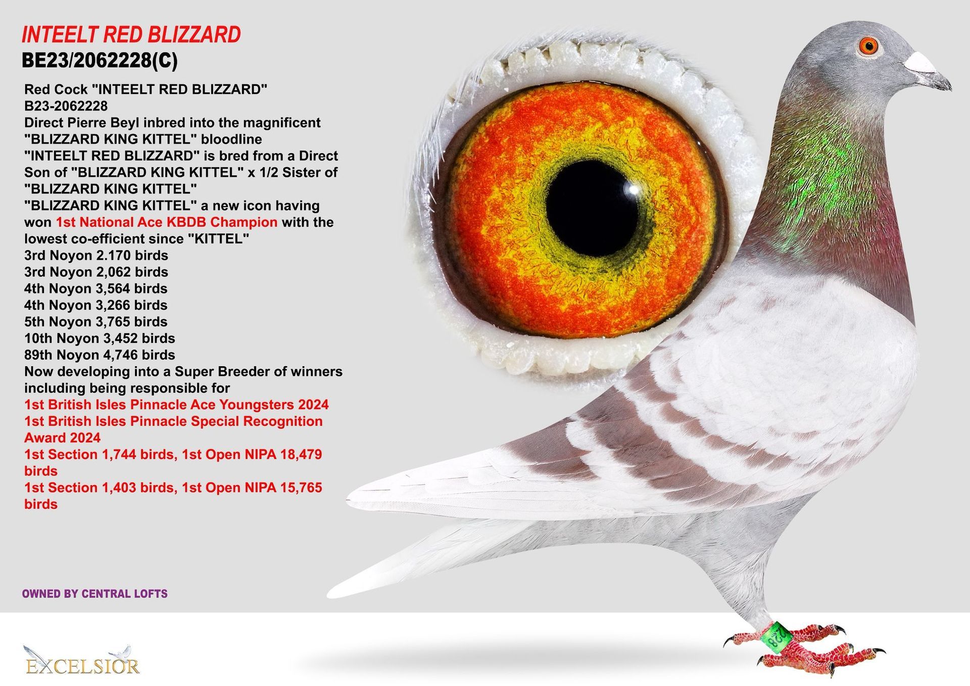 You may have seen us announce that we have ordered a FULL ROUND of pigeons from the breeding loft of Pierre Beyl for the 2025 season. To start us on our journey with the Beyl pigeons we've just introduced this magnificent Red Cock called "INTEELT RED BLIZZARD"